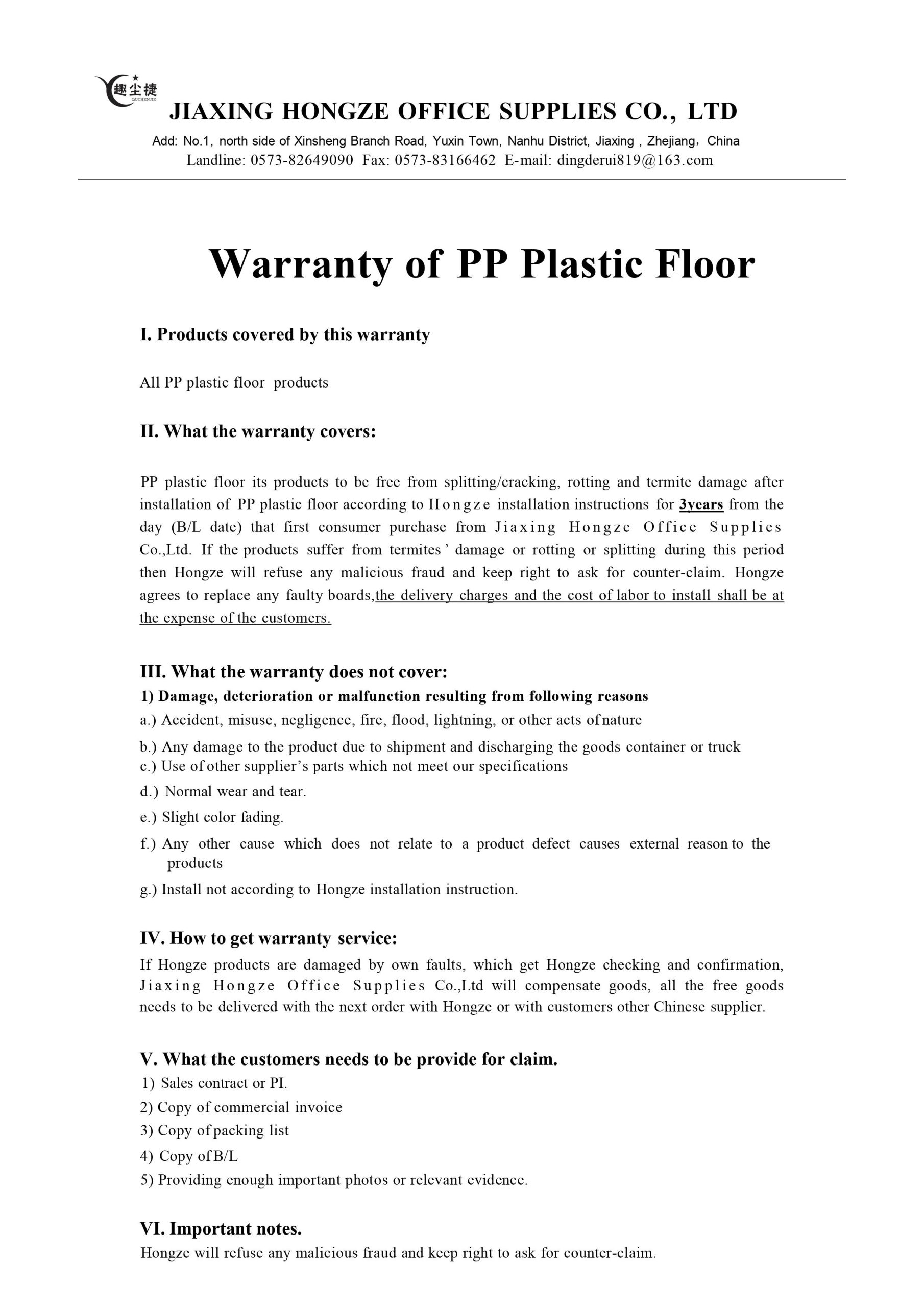 Warranty of PP Plastic Floor